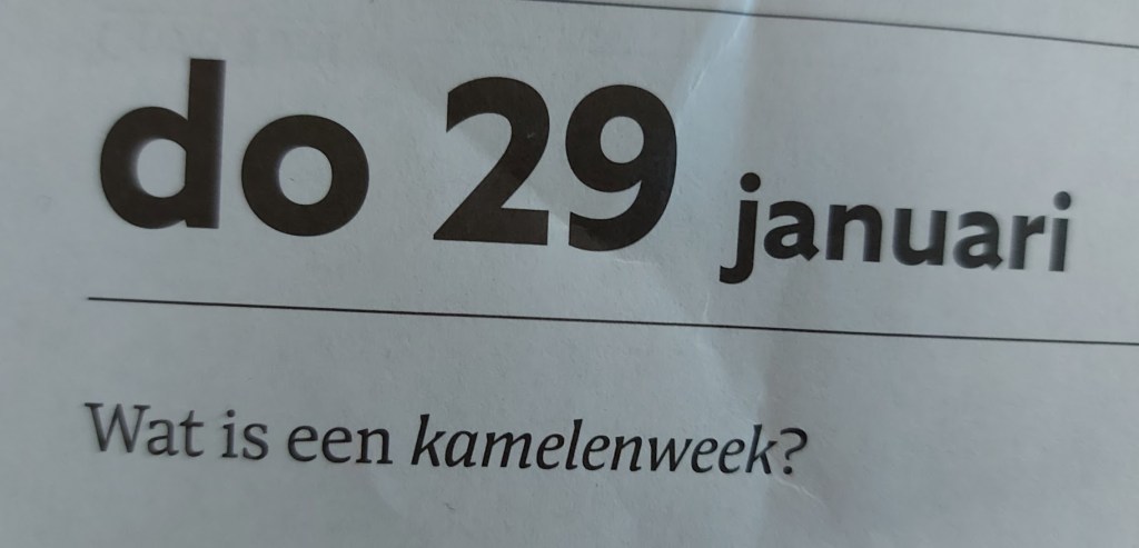 De kamelenweek: De kamelen uit de week halen. Stelt u zich voor dat er een kameel op een drukke weg staat, welke file dat zou veroorzaken. Zulke files zouden vooral op dinsdag en donderdag voorkomen (didodrukte). Deze piekdagen zijn de bulten van een kameel in een werkweek. Â Het zijn klaarblijkelijk vaste dagen dat mensen naar kantoor gaan om daar te werken. Daarom proberen werkgevers hun werknemers ook op andere dagen naar kantoor te krijgen om de kamelen uit de week te halen. (Laura van Eerten)