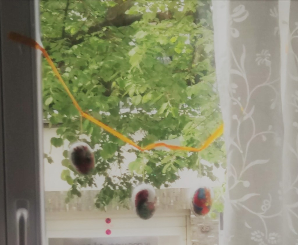 Toen ik mijn living binnenkwam, zag ik dat de kartonnen paaseitjes nog aan dat lintje hingen voor het raam. In paniek wilde ik ze er al vanaf trekken met de gedachte wanneer was dat ook alweer, Pasen? Oh ja, dat was pas gisteren. Ik heb ze dan nog maar wat laten hangen.
