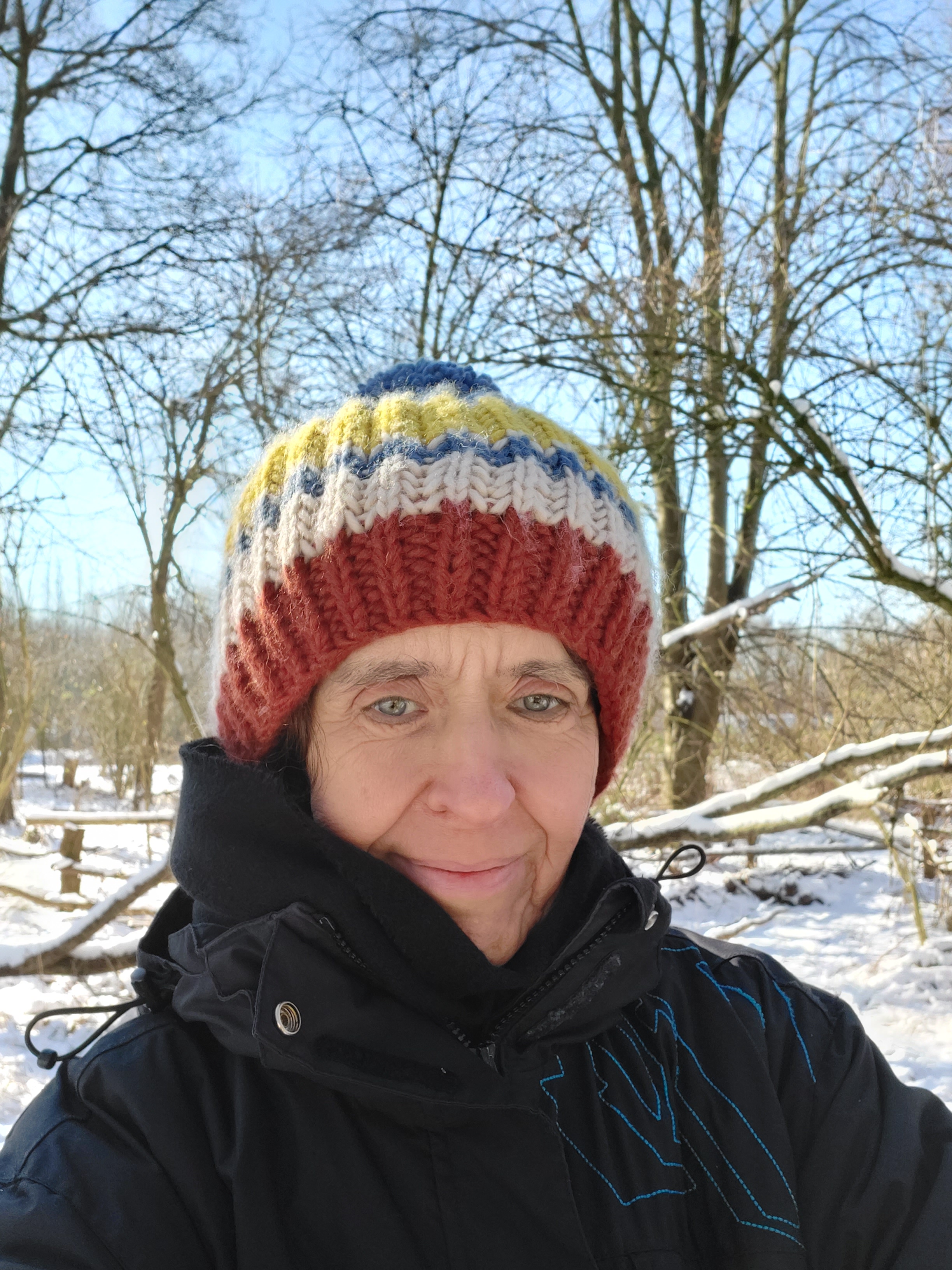 Het is overigens de eerste winter dat ik zo vaak mijn muts opzet. Ik voel me beter na een toertje buiten. Met die warme schedel (ook al heb ik best nog veel haar) geen koude hoofdpijn meer, warme oren en zelfs de overprikkeling mindert. Als die er al is want ik verkies rustige momenten om echt buiten rond (of vierkant) te toeren. Ik geniet warempel van het stilstaan bij de grote vijver, bij de vogels die allemaal in dezelfde richting op het water of op het ijs staan. Met mijn gezicht in de zon genietend, natuurlijk goed en wel ingesmeerd tegen al te felle zonnestralen en mijn ogen potdicht en mijn hoofd vol woorden onder die muts. Weer binnen, toen de muts weer af was, luchtte ik mijn hoofd door mee te doen aan een schrijfwedstrijd. Zomaar tien gedichten gevonden, in mijn hoofd en in mijn laptop. Die in mijn laptop heb ik wat herschreven. Bij tijd en wijle hoort u er nog van. Voor nu, ssst!