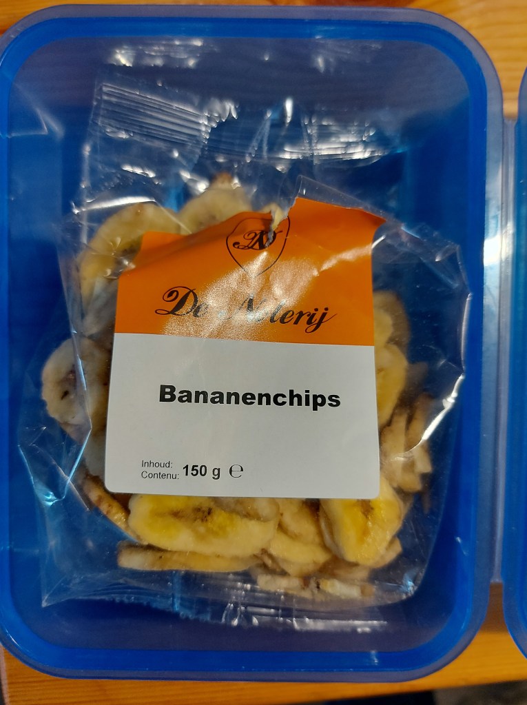 Bij de Noterij mag ik een extra zakje kiezen bij mijn aankopen (gemengde rozijntjes en een notenmengeling). Ik kies als extra’s bananenchips.