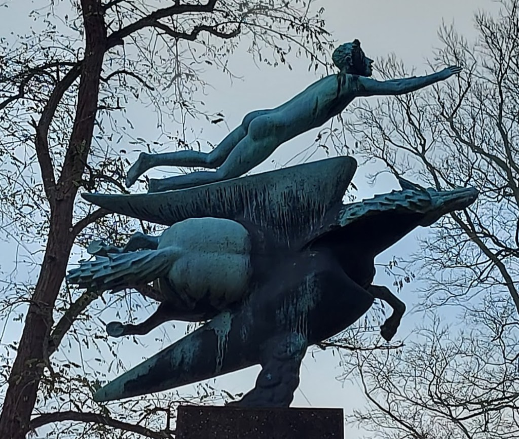 In de namiddag wandelde ik door het park hier dichtbij, voornamelijk om inspiratie op te doen voor de Novemberverzen van Azertyfactor. Tot nog toe heb ik er drie gepost. Ik maakte hier en daar een foto en wilde een nogal grote vogel, aan de andere kant van de vijver, van wat dichterbij nemen. Misschien voelde hij/zij het want hij/zij vloog weg. Wat een mooie vleugels annex vlucht in de bocht over de vijver verder weg  …
