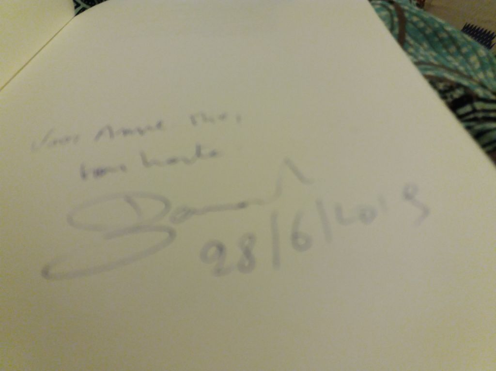 Later na de lezing, kwam ik in de verleiding van een gedichtenbundel ‘Naar het gras’ te kopen en wel omwille van het eerste wat ik erin las toen ik het opensloeg … “Nu ik nooit van hier zal zijn en dagelijks afkomstiger ben van elders, …” en ik dacht vanzelf “Hoe schoon is dat!”. Aangezien de heer Dewulf daar ook nog was, heb ik het laten signeren. Mét de juiste schrijfwijze van mijn naam, de datum echter klopt niet, dat was de 27ste juni 😉.