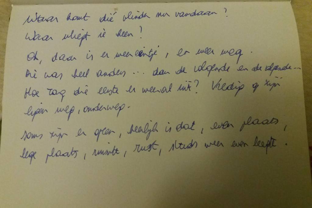 Vele dingen zijn nog dezelfde, andere veranderen. Wat in mijn leven een grote plaats inneemt, is schrijven. Het maakt zowaar niet uit wat ik schrijf, hoe ik schrijf en waar ik het doe. Wel dát ik het doe. Bijvoorbeeld hele monologen in mijn hoofd om dan te schrappen, te laten wegwaaien over de voetgangers- /fietsbrug of in denkballonnetjes achter me aan of voor me uit.