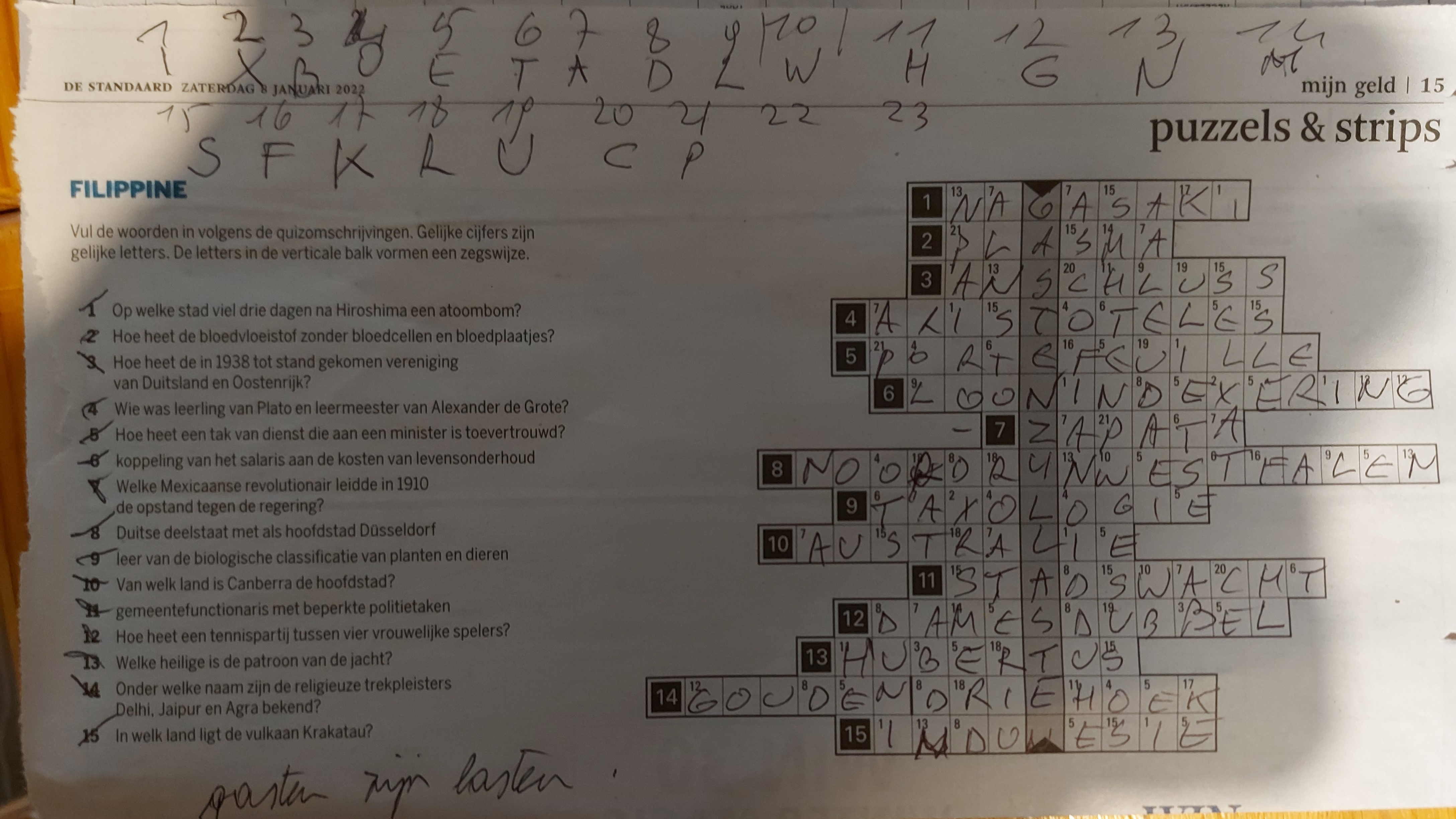 Een andere keer, vele jaren later en na enkele Ithaka reizen, zat ik te wachten om in te schepen in mijn vliegtuig van Athene naar Brussel. Het was nog in de oude luchthaven. Mijn reisgenote en ik hadden Nieuwjaar gevierd en reisden begin januari terug. Zij herkende iemand die ook bij onze vlucht aan het wachten was en riep hem. Het was een Griekse man, een knappe Griekse man, een vrijgezelle knappe Griekse man! Ik volgde het gesprek en onthield zijn naam en familienaam en waar hij woonde. De reisgenote bleek meer geïnteresseerd in zijn broer, aan het gesprek te horen. Toen het bijna Valentijn was, dacht ik er weer aan. Waarom zou ik niet nog eens een kaart schrijven? Gewoon een beetje de maand pimpen, me vrolijk voelen. Kwaad kon het zeker niet. Het werd een tekst in het Grieks, waarin ik vertelde dat ik de ontmoeting met hem in de luchthaven van Athene vlak na Nieuwjaar zo fijn vond. Ook al had ik niet zoveel gezegd. Helemaal onderaan, in piepkleine cijfertjes schreef ik het nummer van mijn eerste gsm. Na enkele weken was ik het al bijna vergeten toen iemand – met een voor mij onbekend nummer – me opbelde. Dát hij me opbelde, gaf me meer een boost dan dat hij het was. Misschien dat ik daarom afsprak. We hebben elkaar een paar keer ontmoet, heel gewoon iets gaan drinken. Intussen had ik ook al over zijn reputatie gehoord; trouw zijn stond niet in zijn woordenboek, ook niet in zijn Grieks woordenboek. Hij was aangenaam gezelschap, dat wel maar toehappen deed ik niet. Daar liep het contact dan ook spaak. Een hele tijd – jaren – later kwam ik hem nog eens tegen, gewoon op een terrasje waar ik ook iets zat te drinken. Hij ging trouwen. Hij ging trouwen met een Griekse vrouw. Die vrouw had hij daar leren kennen en zij kwam naar België. Ik weet niet hoe trouw hij haar was of niet. Wat ik me wel herinner, was toen hij en zijn kameraad opstapten, hij langs mij heen liep, even zijn hand op mijn schouder legde en me ‘het allerbeste’ wenste. Toch volwassen geworden, die Griekse Don Juan?